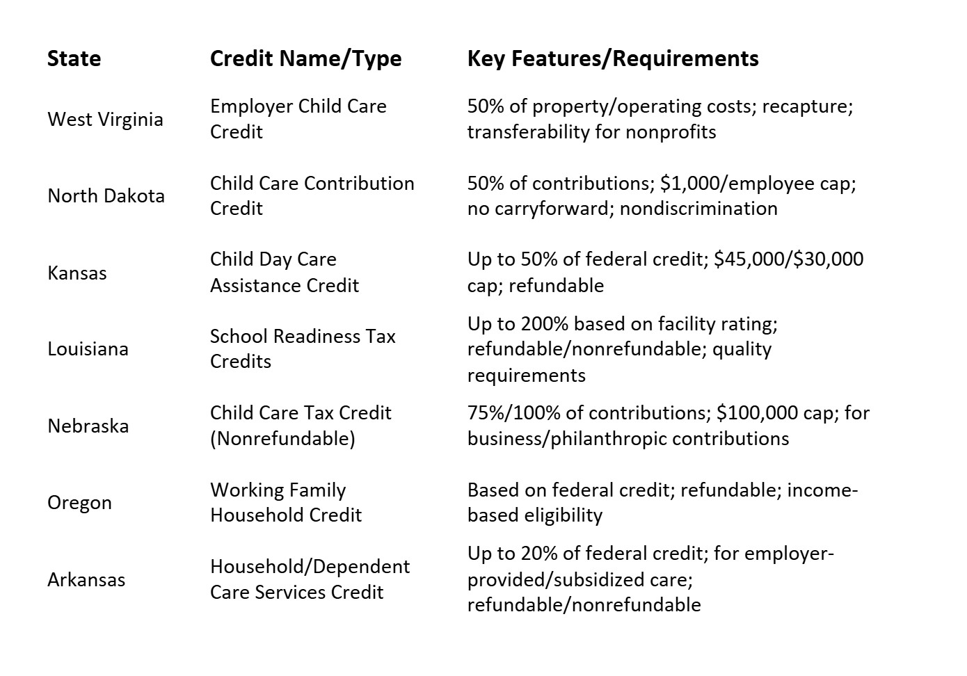 The federal Employer-Provided Child Care Credit, (Internal Revenue Code Section 45F), is a general business credit available to employers who incur qualified childcare costs for the benefit of their employees.